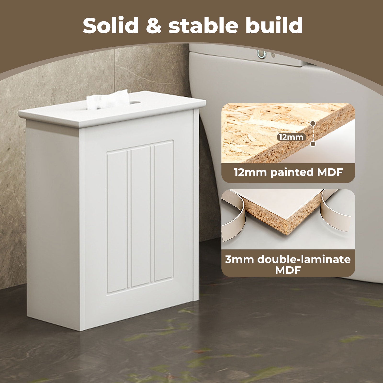 Crafted from durable, water-resistant MDF, the bathroom storage box ensures that your bathroom essentials, like toilet paper storage, cleaning products, and toiletries, stay dry and easy to access. Its sleek, white finish complements any bathroom decor, while the minimalist style adds a touch of elegance.