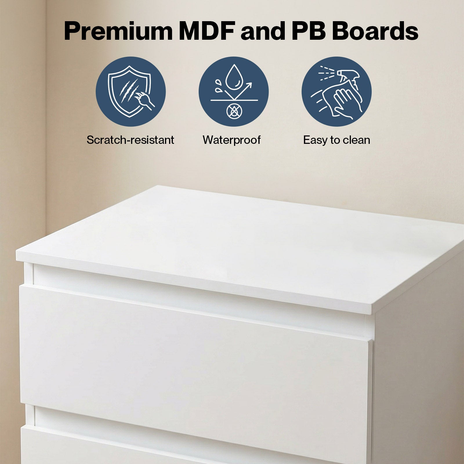 Elevate your bedroom style with the modern bedside table. This sleek white bedside table features three spacious drawers, offering abundant storage for all your nightly essentials. Crafted from durable MDF and PB board with a smooth, moisture-resistant surface, this bedside table with drawers combines practicality with contemporary design. The top surface can hold up to 30kg, and each drawer supports 5kg, making this 3 drawer bedside table both sturdy and functional. Perfect as a nightstand or bedside cabinet, it fits effortlessly beside your bed or in your living room, hallway, or study. The minimalist white finish and clean lines of the bedside table complement modern interiors, while the easy-to-clean surface ensures lasting beauty. Compact yet versatile, this small bedside table is ideal for any bedroom setup. Brand guaranteed by ensuring quality and style.