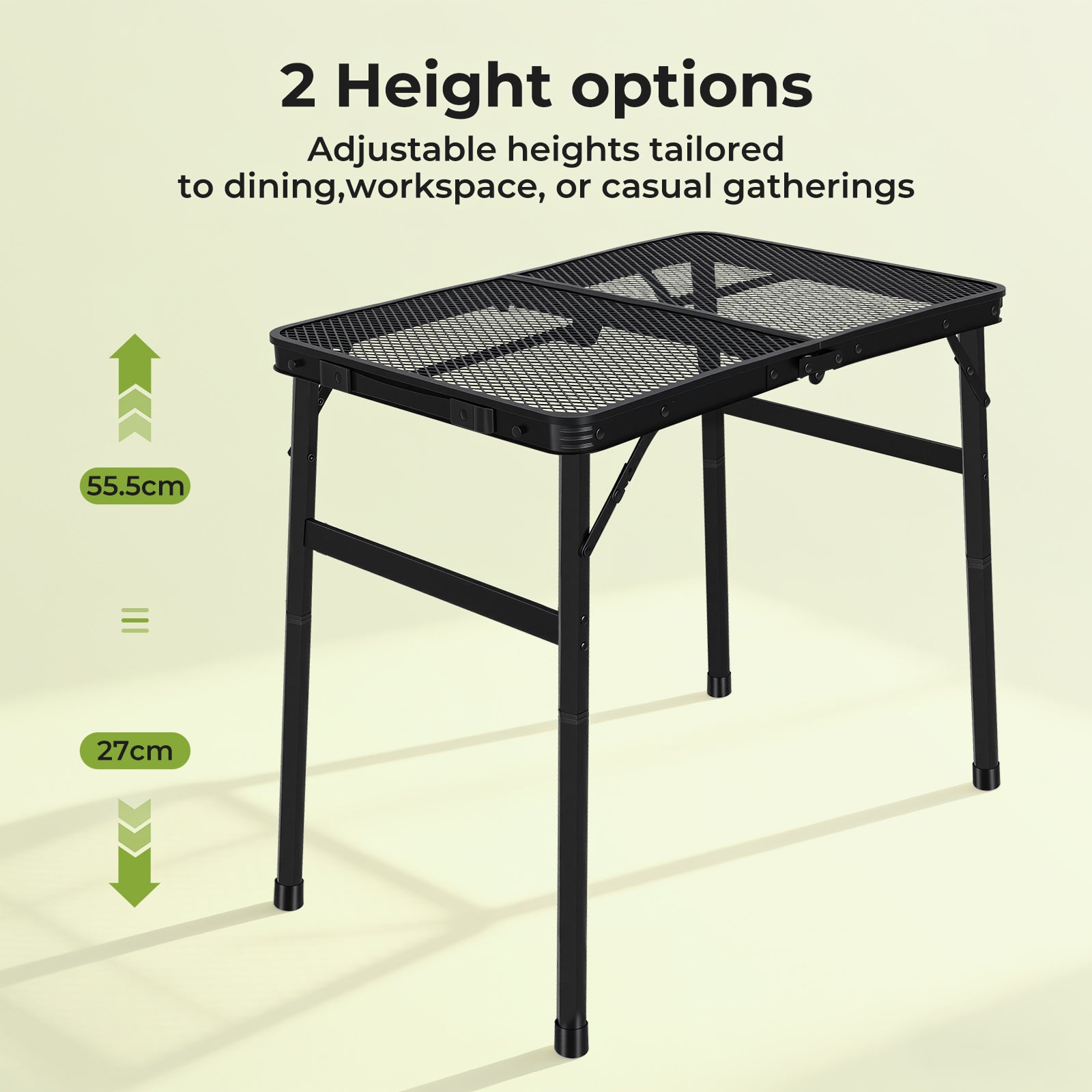 This camping table foldable design allows quick setup and compact storage, while the adjustable height camping table function offers two height options (27cm or 55.5cm) to suit different seating or ground-level needs. With a compact 60 × 40cm surface, it also works perfectly as a picnic table portable or side table for camping gear.