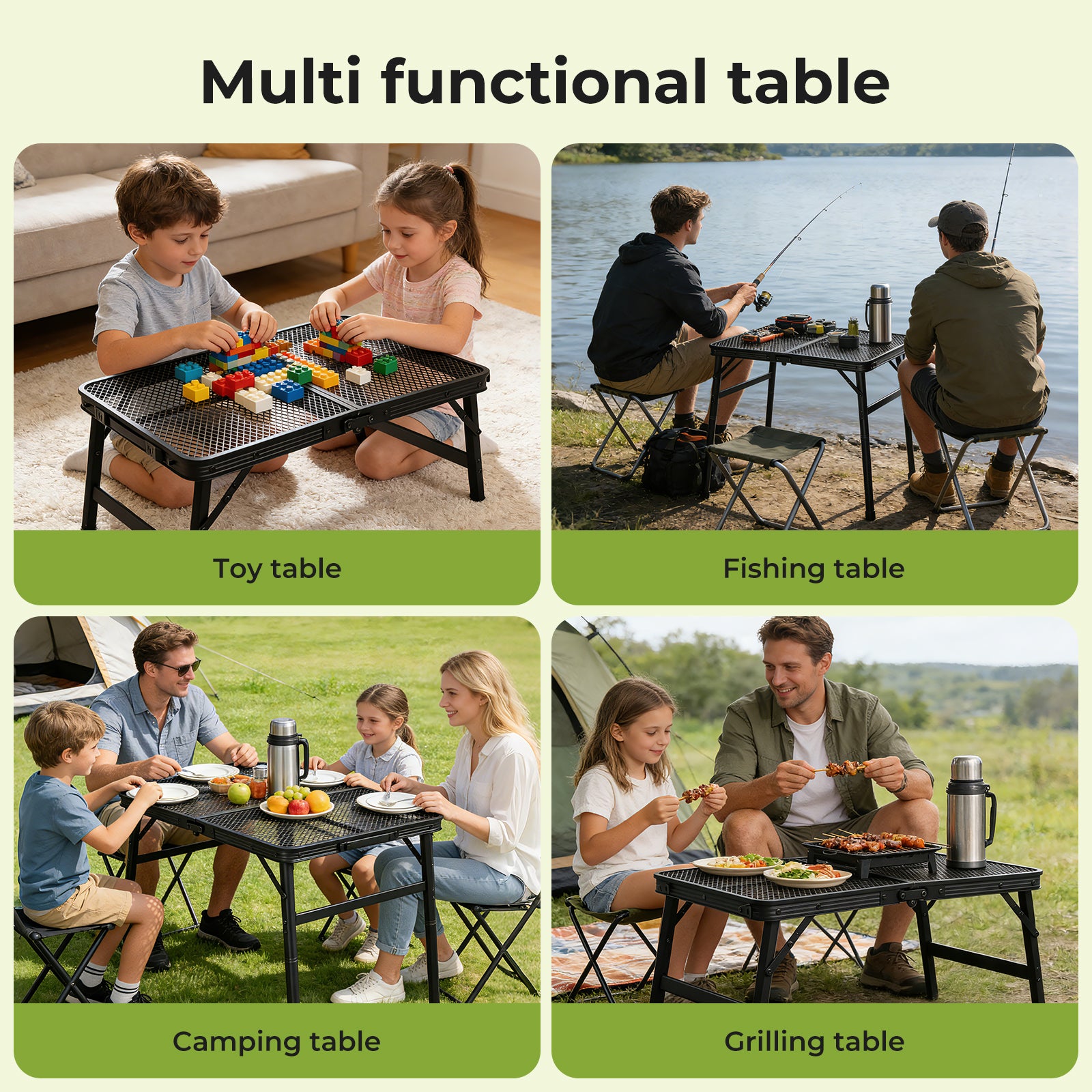 The metal mesh tabletop is waterproof, heat-resistant, and easy to clean, making this outdoor folding table well suited for year-round use. Unlike solid panels, the mesh design prevents water buildup and improves durability in changing outdoor conditions.