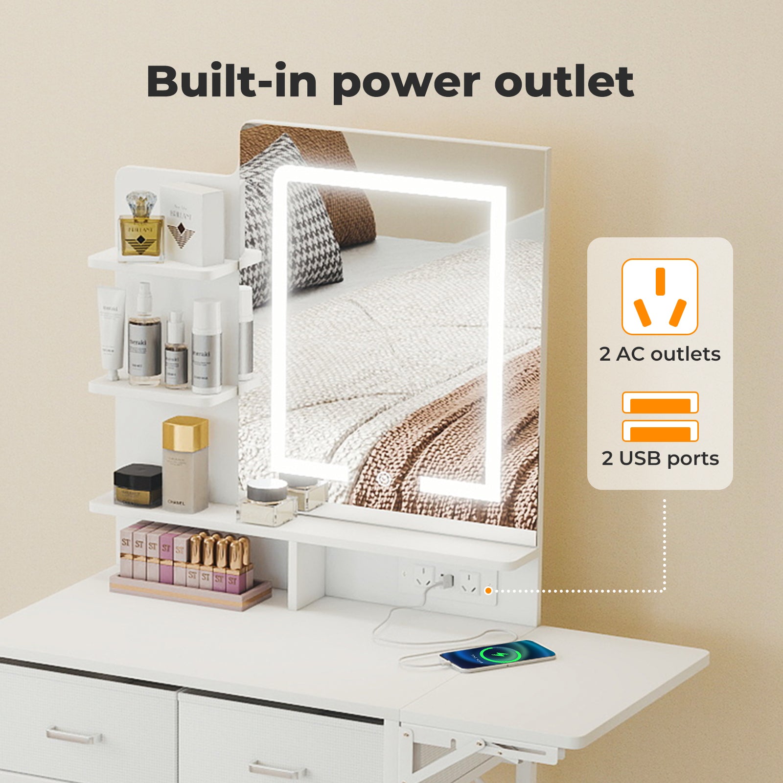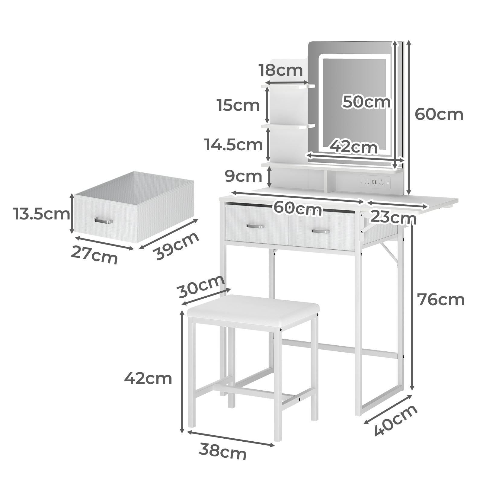 Thoughtful storage is at the core of this Levede makeup vanity desk. The layout includes a folding tabletop, two fabric drawers, three open shelves and dual desktop dividers, providing ample space for cosmetics, jewellery and beauty tools. An integrated power solution with two standard sockets and two USB ports allows simultaneous use of devices, making this vanity table with mirror both convenient and efficient.