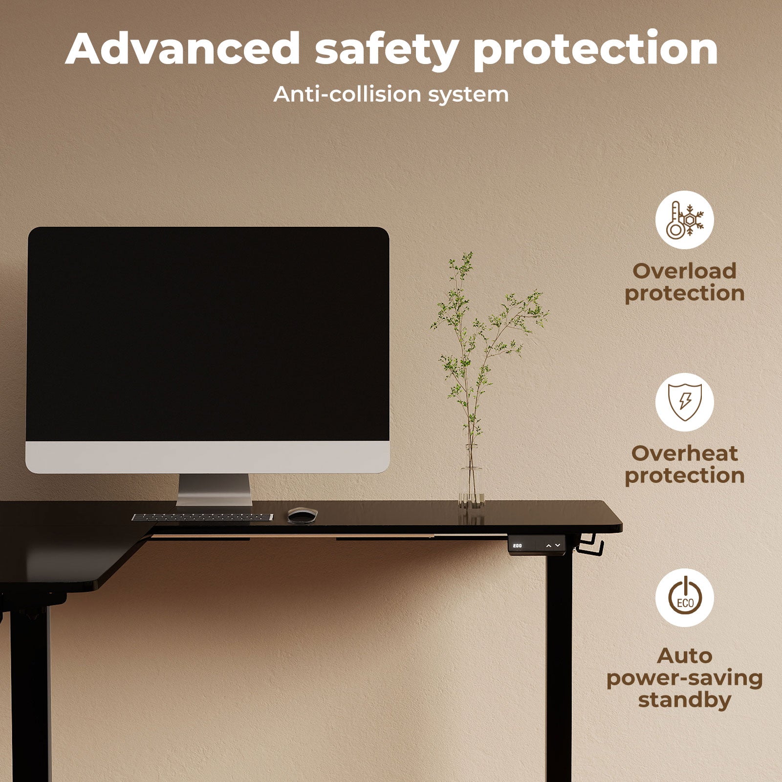 electric sit stand desk features a quiet single-motor system with noise levels ≤55dB, allowing you to switch seamlessly between sitting and standing positions without disruption. The desk comes with a digital display and 2-level memory function, making this electric standing desk adjustable to your preferred heights with ease. Equipped with an advanced anti-collision system, the motorised sit stand desk automatically stops and reverses if it detects obstacles, while overheat and overload protections keep your workspace safe.