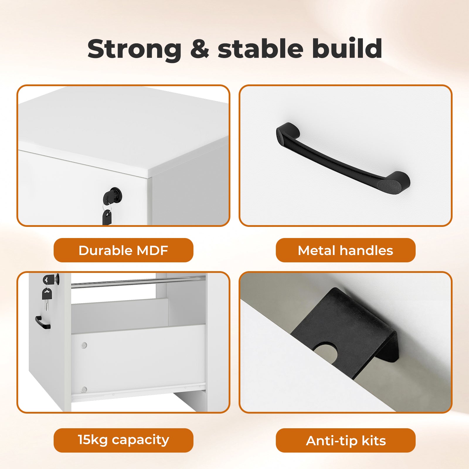 Crafted from durable MDF and equipped with sturdy metal handles, this lockable cabinet provides added security with its independent locking system, each drawer comes with 2 keys for privacy. The smooth gliding tracks make accessing files effortless, while the tall storage cabinet design fits easily into tight spaces, maximizing your office organization.