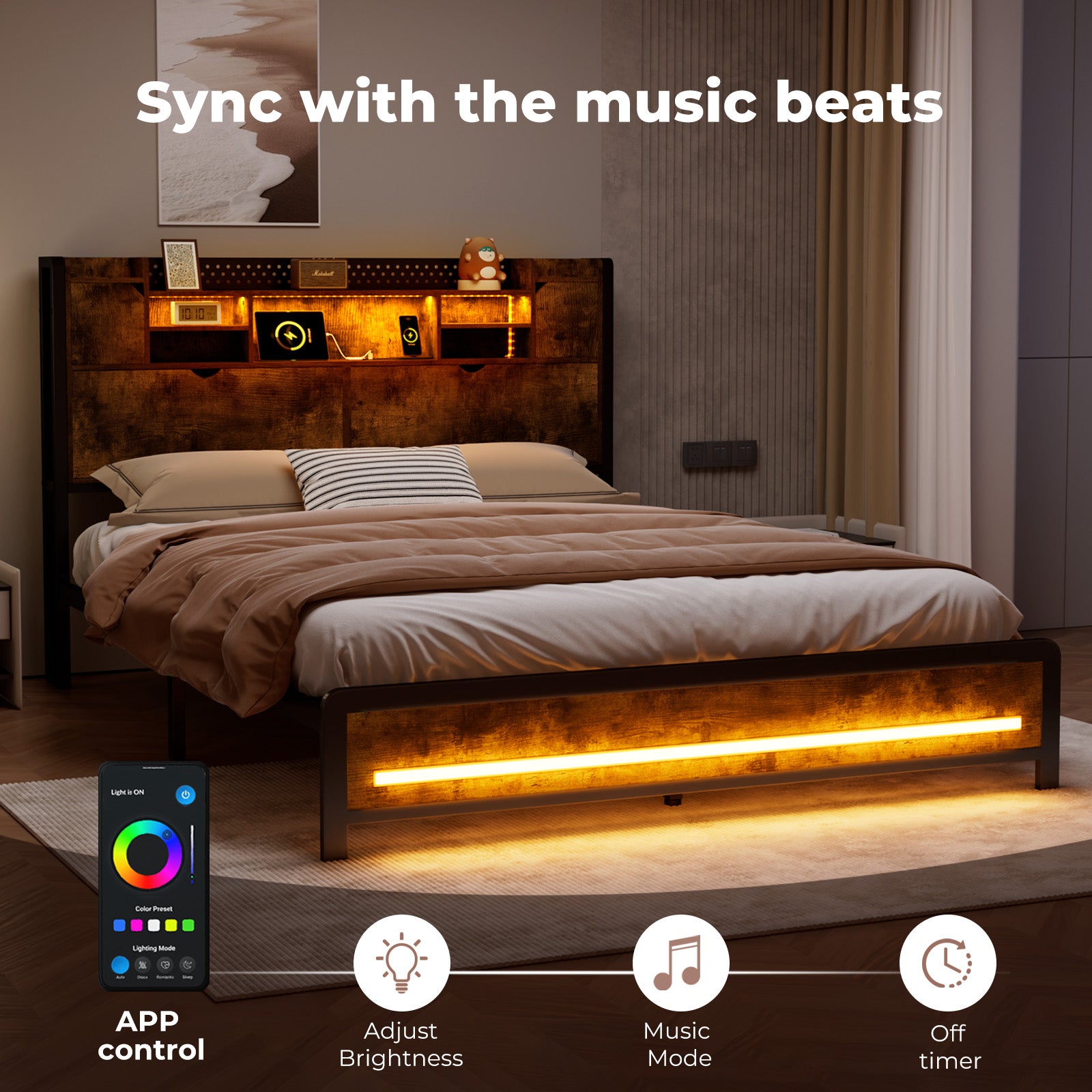 Upgrade your sleep space with the bed frame, the perfect combination of modern design and everyday functionality. This industrial-style bed frame features a stunning RGB LED headboard, ideal for setting the mood in your bedroom. The built-in charging station with 2 AC outlets and 2 USB ports keeps your devices powered right by your side.