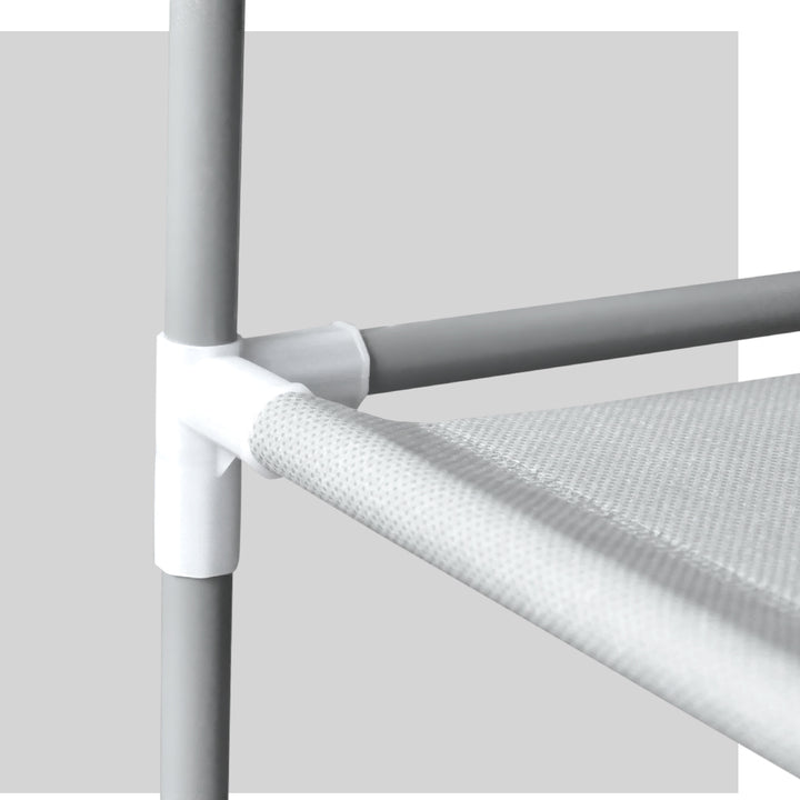 The non-slip shelves are fully adjustable, accommodating various shoe sizes—from sneakers to sandals—while the sturdy construction, featuring durable steel tubes and resin siding connectors, ensures long-lasting use. This lightweight rack can be customized to your needs, allowing you to build it into any number of levels.