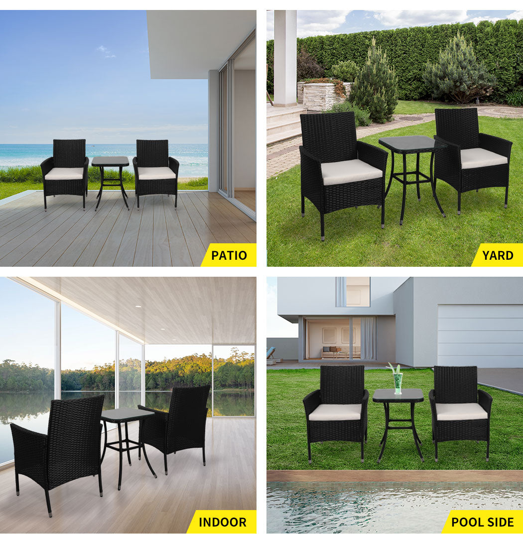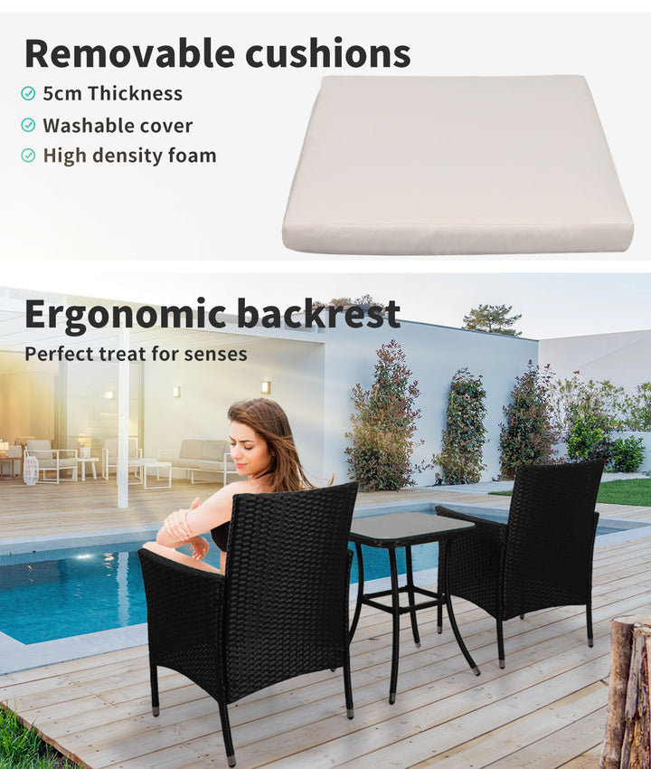 Made from premium quality PE wicker. The entire frame is made of galvanized steel, highly durable and reliable. Powder-coated for extra protection, designed to be weather-resistant, rust-resistant, and corrosion-resistant. Not easily affected by rain or blazing sun. The tabletop is designed with extra strong tempered glass, can withstand pressure not easy to break. Very easy to clean and maintain with its unique built removable and washable cushion.