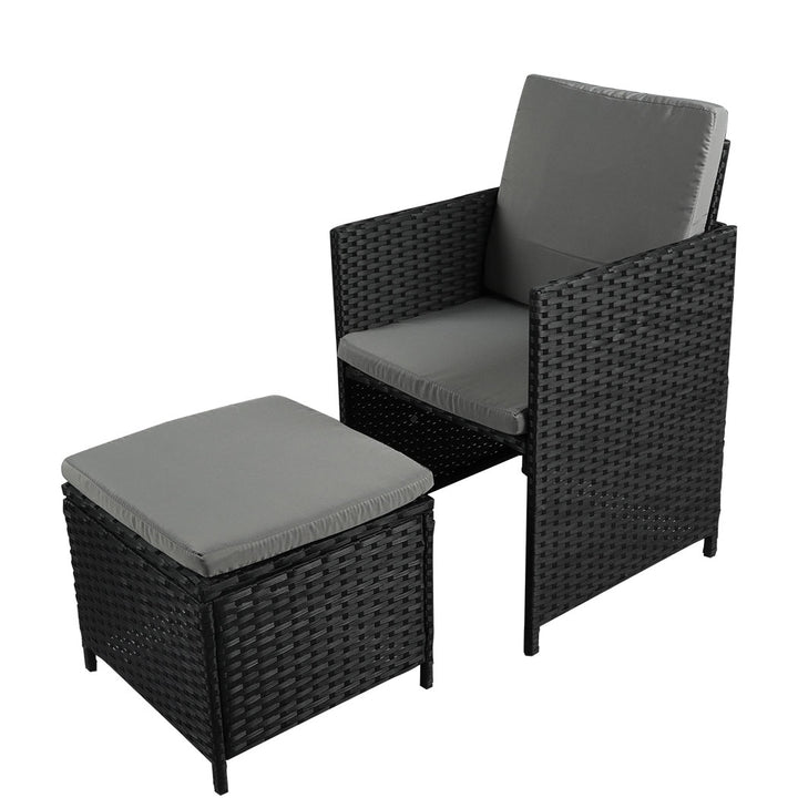 You didn’t choose the outdoors life, the outdoors life chose you. Set-up your outdoor table and chairs set under your pergola. Pull out the chairs from underneath the table and the ottoman from underneath the chairs.