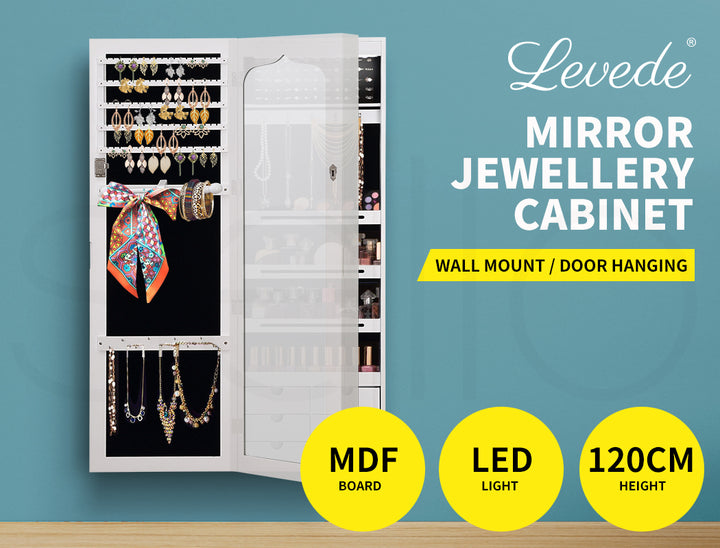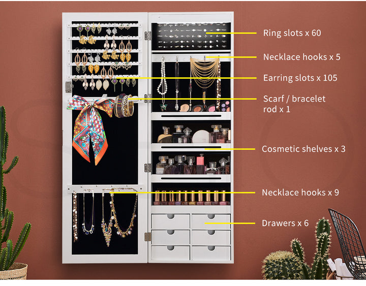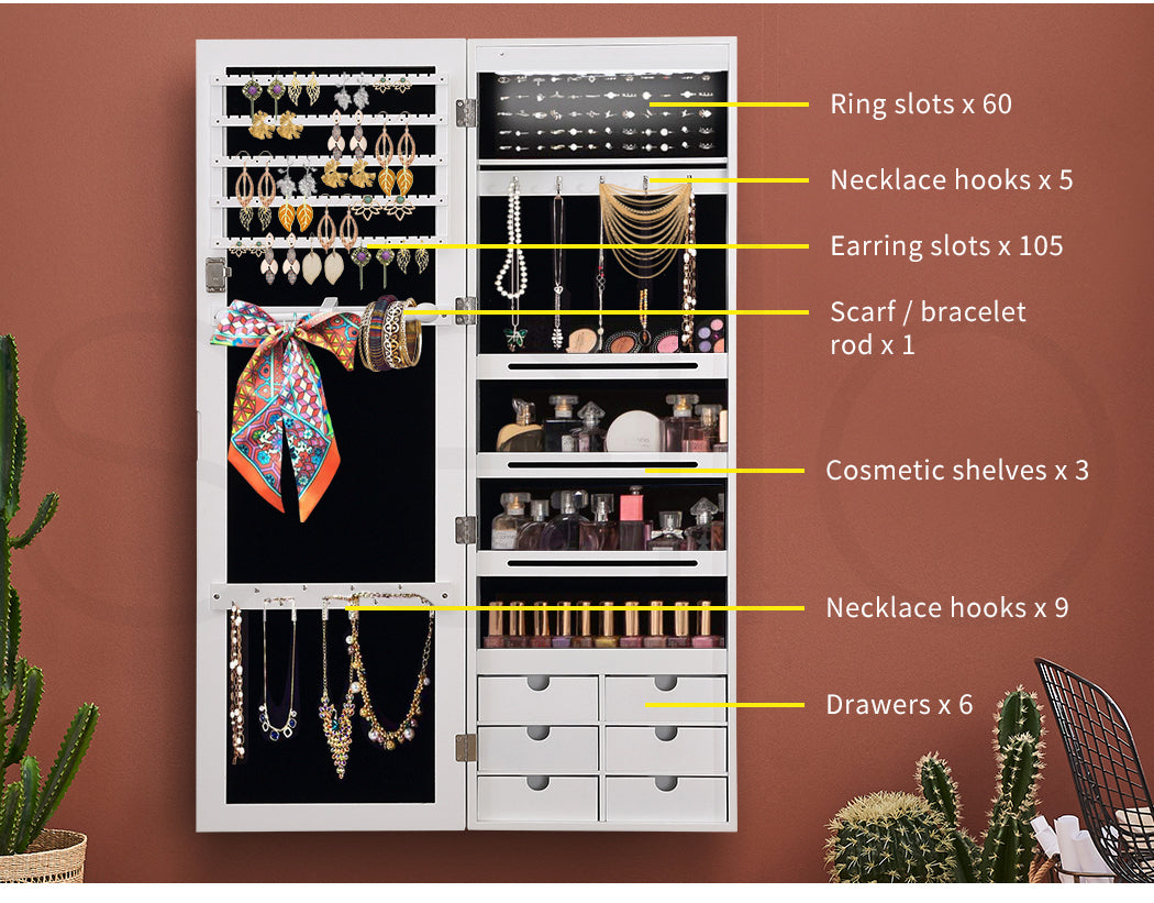 It's not only a full-length mirror, but also a Jewellery Cabinet. It's a true reflection of beauty! It can be wall mounted if space is limited. And it can also hang on the door. The classic design works well with any style of bedroom. Open it and it's a beauty wonderland. You'll find ample storage space for your jewellery pieces with slots for earrings and rings, hooks for necklaces, rod for scarf, pouches for cosmetic brushes, shelves for various items.