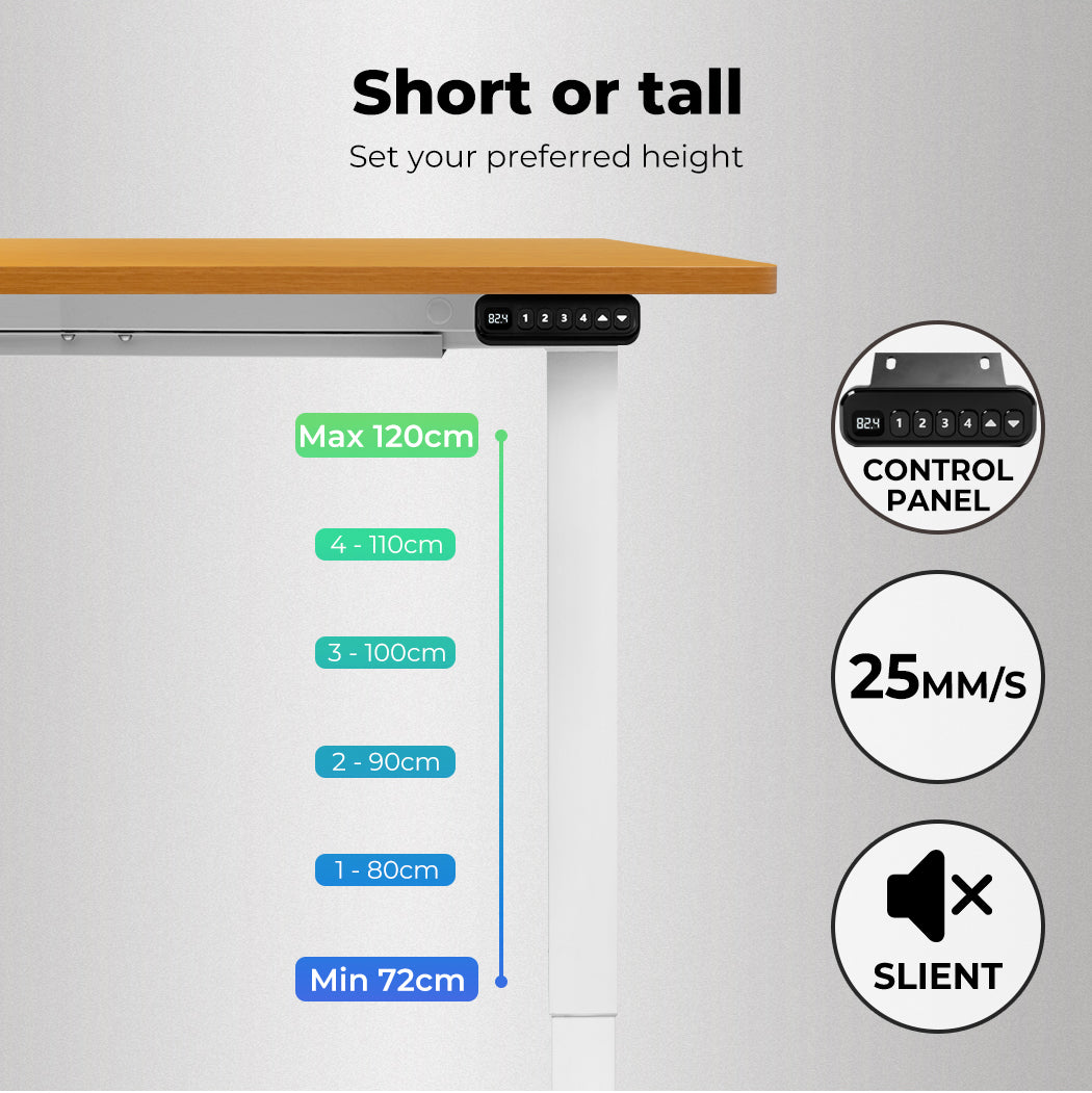 Transform your workspace with a motorised standing desk that perfectly blends style and functionality. This innovative desk allows you to combine a wooden table top with a motorised frame, creating a versatile sit-stand solution tailored to your needs. Simply plug it into your power socket and let the motor do the lifting, enabling you to easily switch between sitting and standing positions.