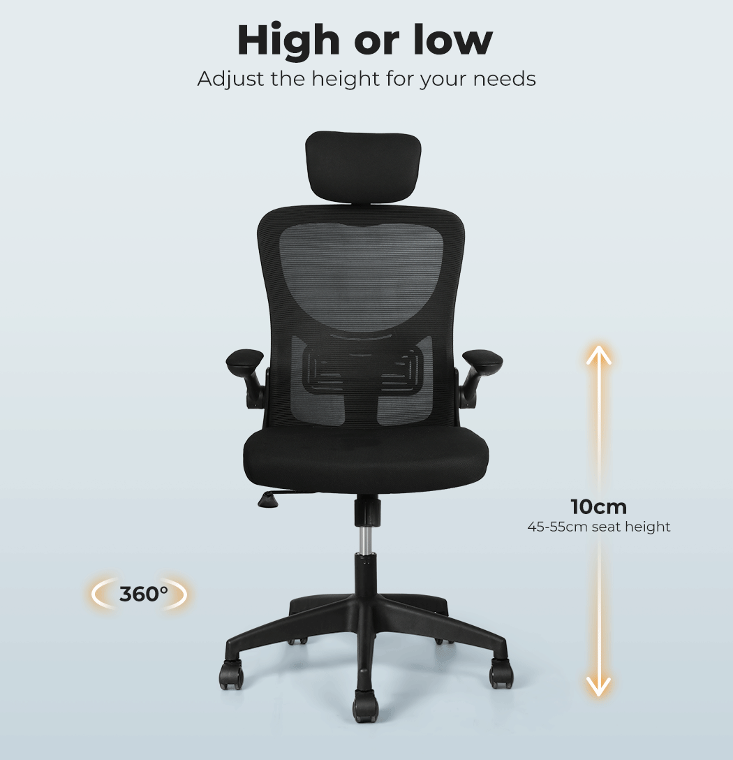 Upgrade your workspace or gaming station with the Office Mesh Gaming Executive Chair, designed for ergonomic support and lasting comfort. Featuring a premium breathable mesh back and an ergonomic S-curve design, it encourages natural posture while keeping you cool during long sessions. The adjustable headrest (removable for versatility) and flip-up armrests provide customisable support, while lumbar cushioning reduces fatigue.