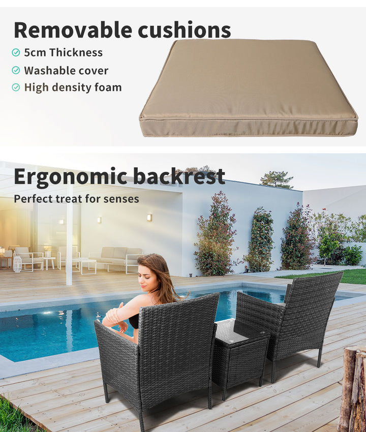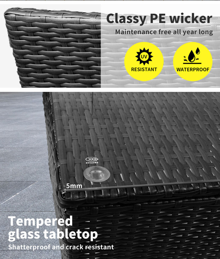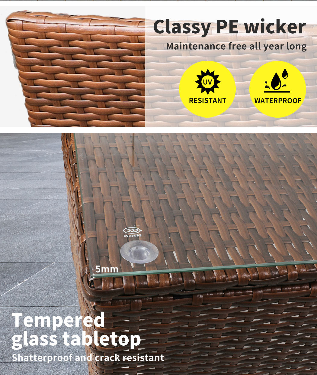 Crafted from premium quality PE wicker, this furniture set is built to last. The robust galvanized steel frame is powder-coated for added durability, making it weather-resistant, rust-resistant, and corrosion-resistant, ensuring it withstands the elements, whether it’s rain or shine. The tabletop is made of extra strong tempered glass, providing a sturdy surface that can handle daily use without compromising on style. Cleaning and maintenance are a breeze, thanks to the removable and washable cushions.