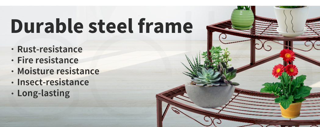 Find the perfect home for your plant stand and load up all your plants without worry. Crafted from a durable steel frame, this stand is designed to withstand the elements, ensuring it remains rust and scratch resistant for years to come. Whether you're bringing your luscious garden indoors or maximizing your outdoor plant collection, this stand accommodates small or large potted plants effortlessly.