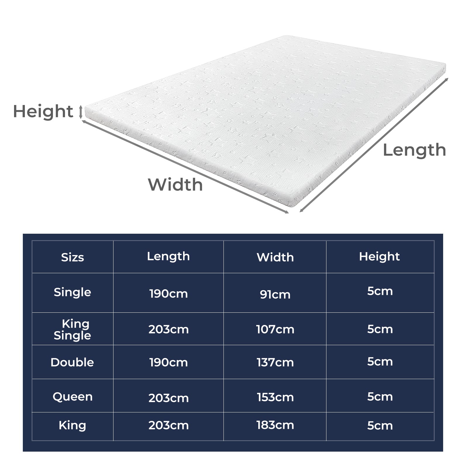 Size: King:203cm x 183cm x 5cm(LxWxH)