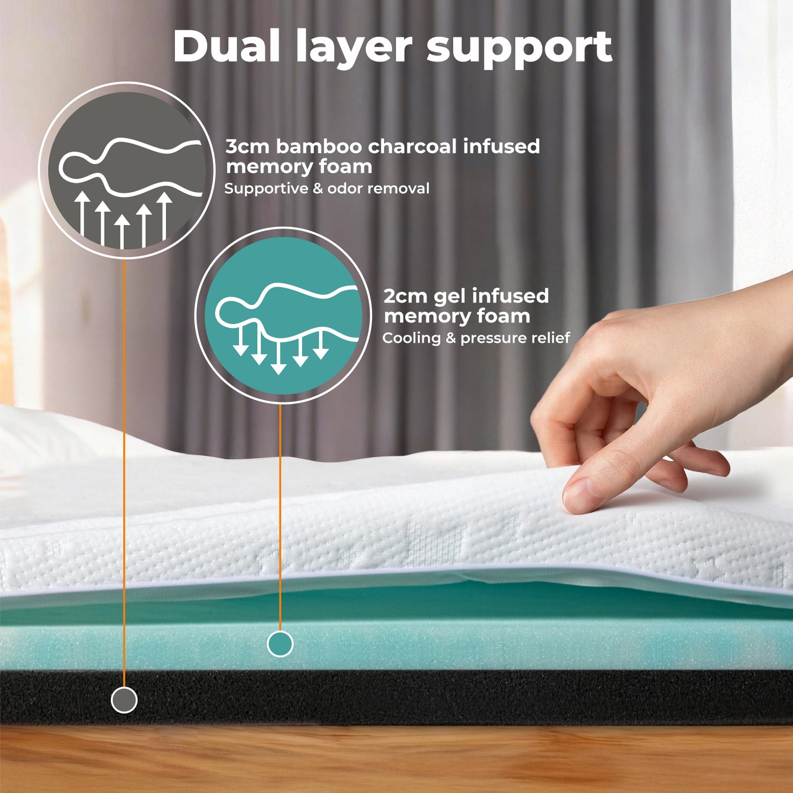 The top layer features a gel memory foam topper that delivers a refreshing sleep sensation. Infused with cooling gel particles, this cooling mattress topper helps regulate temperature while gently contouring to your body, making it an ideal pressure relief mattress topper for side, back, or stomach sleepers. Beneath it, the bamboo charcoal support foam enhances airflow, absorbs moisture and odours, and provides stable spinal alignment throughout the night.