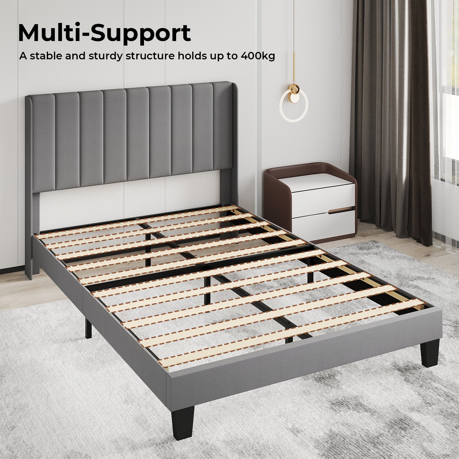 - Comfortable Upholstered Headboard: Padded with sponge and finished with vertical panel design for comfort and modern style.