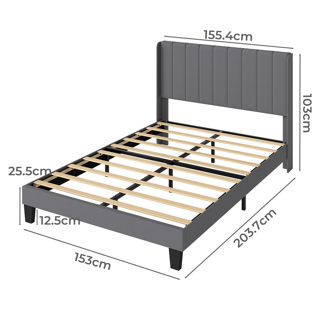 Transform your bedroom with this elegant queen bed frame from Levede, thoughtfully designed for comfort, style, and everyday practicality. This Levede fabric upholstered bed frame features a reinforced metal bed frame structure combined with durable wooden slats, delivering reliable mattress support without the need for a box spring. The softly padded grey upholstered headboard showcases a modern vertical panel design, making it perfect for reading, relaxing, or unwinding at the end of the day.