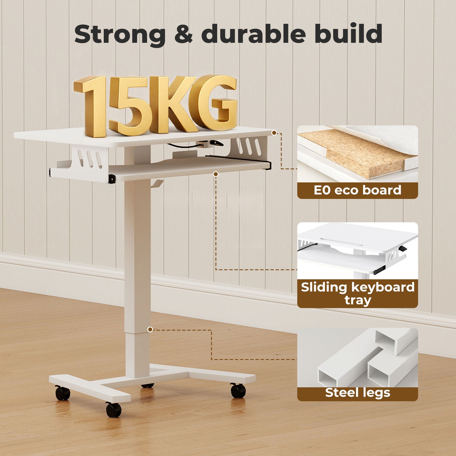 Crafted from E0-grade particle board and a powder-coated steel frame, ensures stability and durability for both home and office use. The compact footprint makes it a reliable home office standing desk, while the four lockable castor wheels transform it into a truly portable standing desk and mobile computer desk that moves easily between rooms. When locked, this adjustable desk with wheels stays firmly in place.