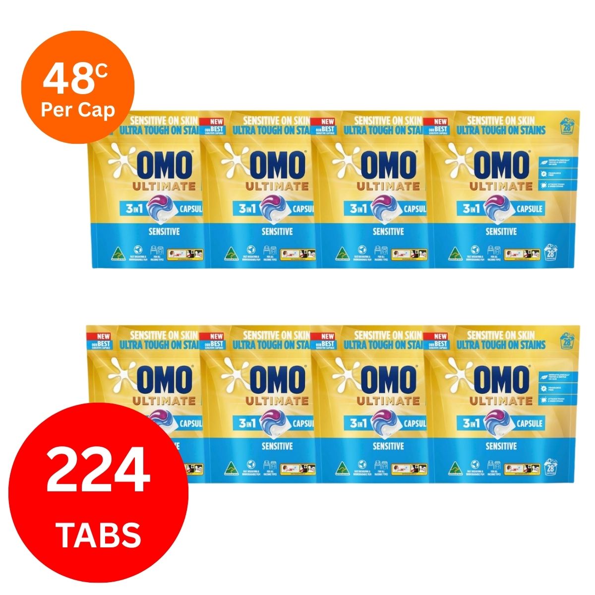 8 x 28pk Omo Ultimate 3 in 1 Sensitive Laundry Detergent Capsules (224 Capsules)