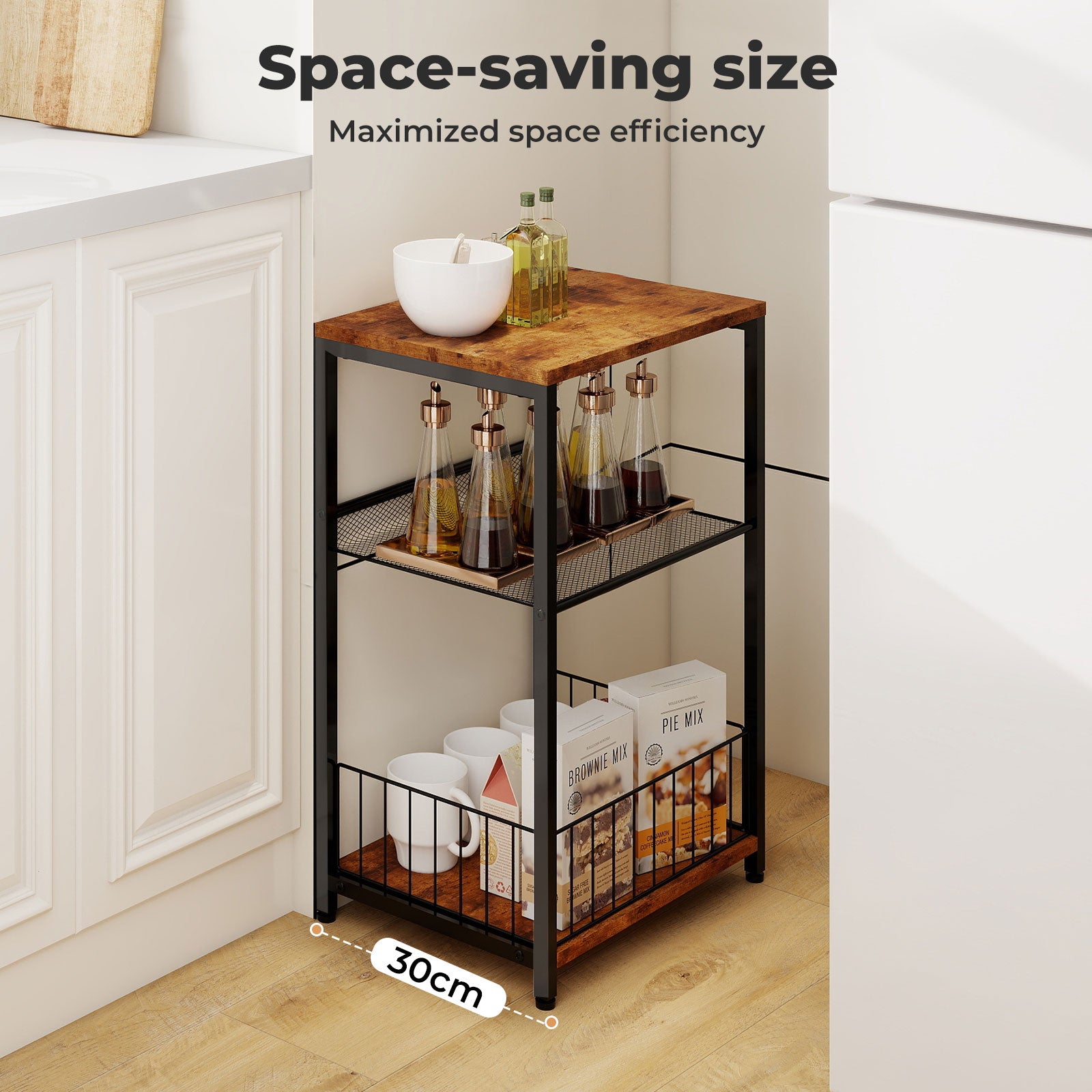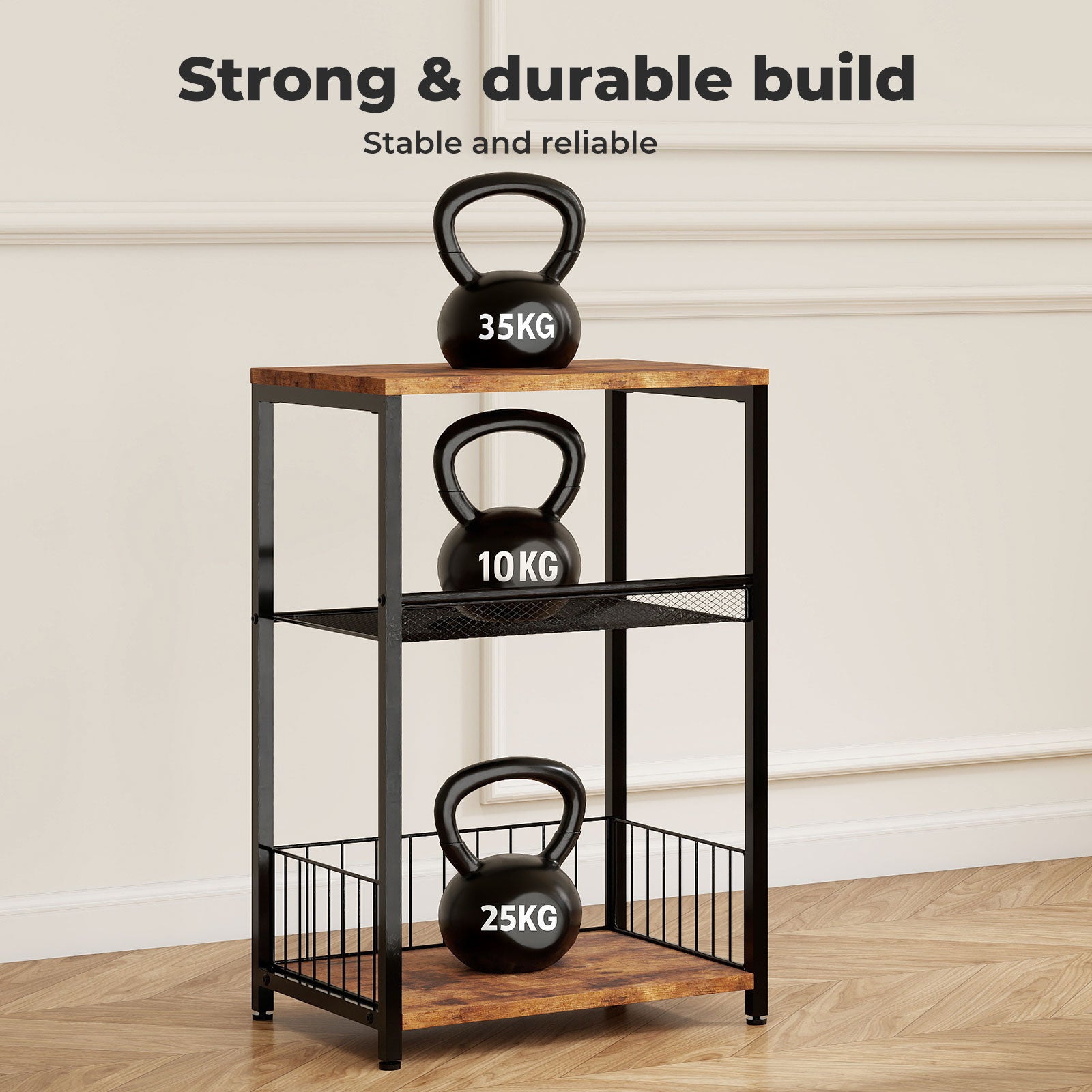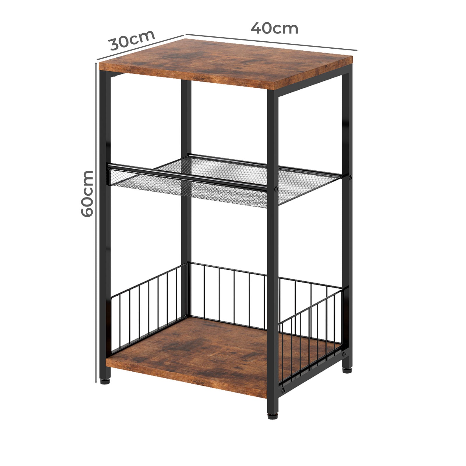 The three-tier structure provides impressive load capacity, with the top shelf supporting up to 35kg, the middle shelf 10kg and the bottom shelf 25kg. The practical mesh frame allows items to be placed flat or at an angle, keeping books, décor or daily essentials neatly organised. Its compact size of 40 × 30 × 60cm makes it an ideal modern side table for small spaces, apartments or tight corners.