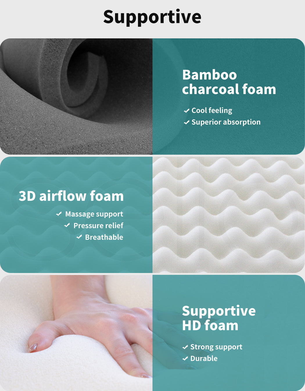 Enhanced with multiple layers of high-density foam, wave foam, PK cotton padding, and bamboo charcoal materials, this mattress ensures excellent pressure relief, moisture absorption, and long-lasting freshness. Ideal for those seeking a comfortable bed mattress that is both supportive and breathable.