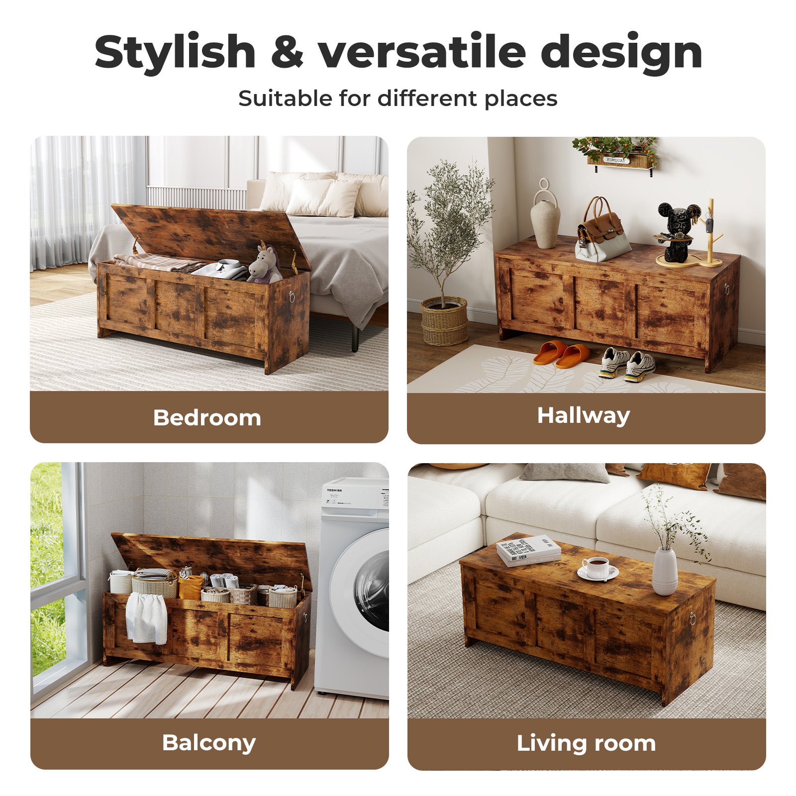 Redefine practical home storage with the rustic-style unit designed to blend seamlessly into any living space. Crafted from durable particle board with a smooth matte finish, this piece offers the perfect balance of style and function. Whether you use it as a storage bench, storage cabinet, storage box, storage chest, or storage table, it provides generous room for organising daily essentials. The sturdy dual-arm structure and chrome-plated hardware ensure long-lasting stability, making it ideal for entryway storage, indoor storage, or general wooden storage needs.