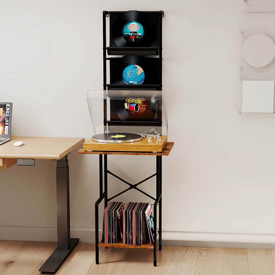 The sleek burnt wood top combined with black steel framing complements any interior, from living rooms to home offices, making it not only a record display stand but also stylish record player furniture. Complete with anti-tip hardware, assembly accessories, and an English instruction manual, the vinyl organizer stand simplifies setup and guarantees safety.